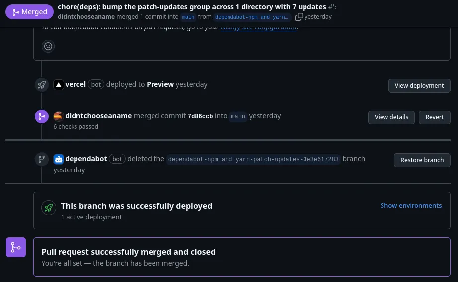 version: 2updates: - package-ecosystem: "npm" directory: "/" schedule: interval: "daily" groups: patch-updates: patterns: - "*" update-types: - "patch" minor-updates: patterns: - "*" update-types: - "minor" pull-request-branch-name: separator: "-" ignore: - dependency-name: "*" update-types: ["version-update:semver-major"]Cette configuration garantit que les mises à jour de dépendances sont révisées et créent une pull request avec prévisualisation vercel, maintenant votre projet sécurisé et à jour sans modifier les fichiers vous-même et avoir un aperçu en direct et automatisé du site web avec les modifications par dependabot :