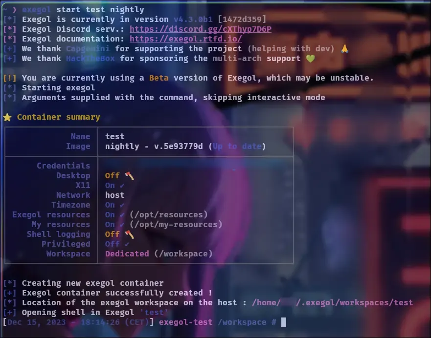 Where test is the container’s name and nightly the docker image it’s based on. You can download exegol images easily with :